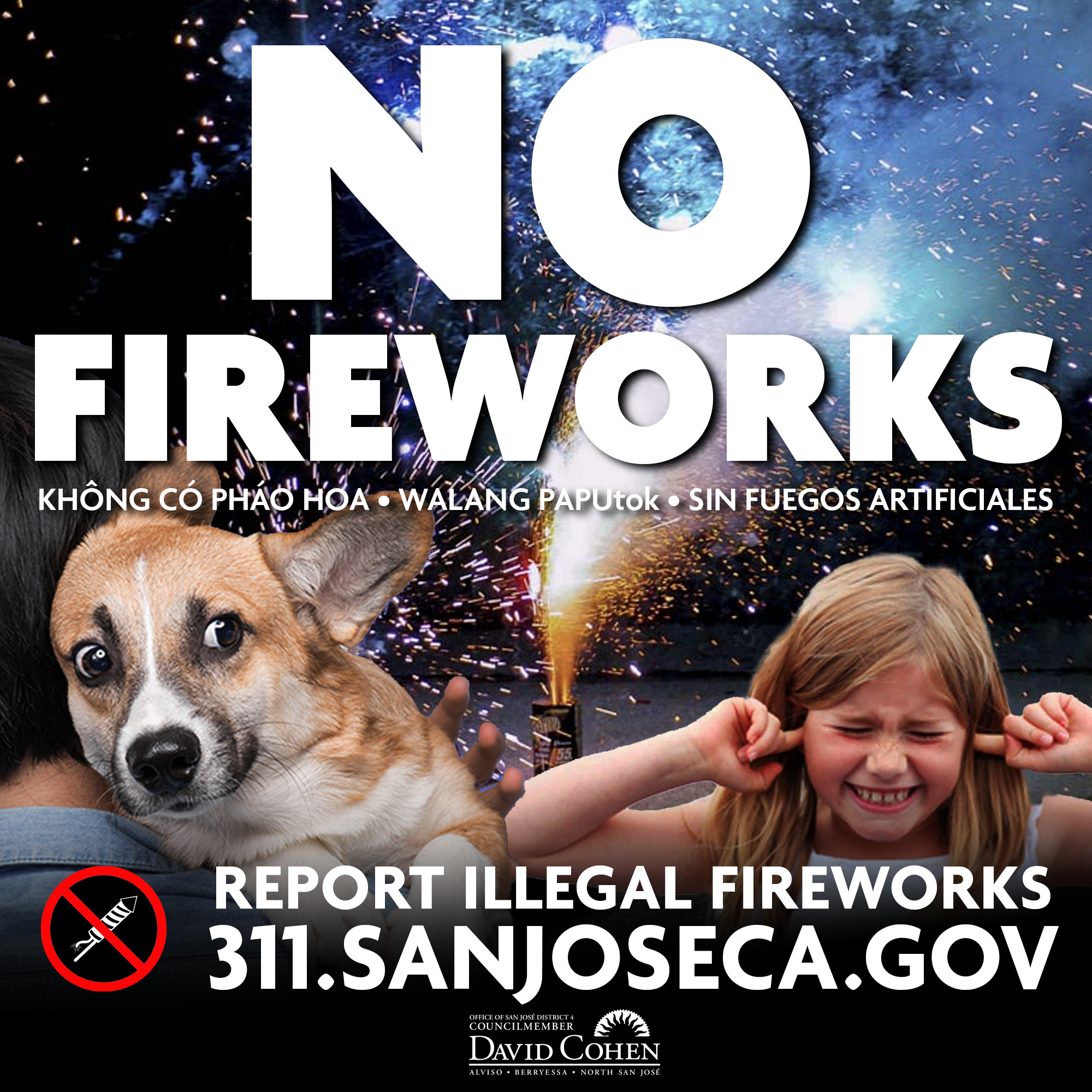 Fireworks are illegal in the City of San Jose. Lighting fireworks in your neighborhood could spark a brush or structure fire. Fireworks also cause stress and trauma in pets and children. You can anonymously report fireworks in your community and upload photo evidence using the 311 app.